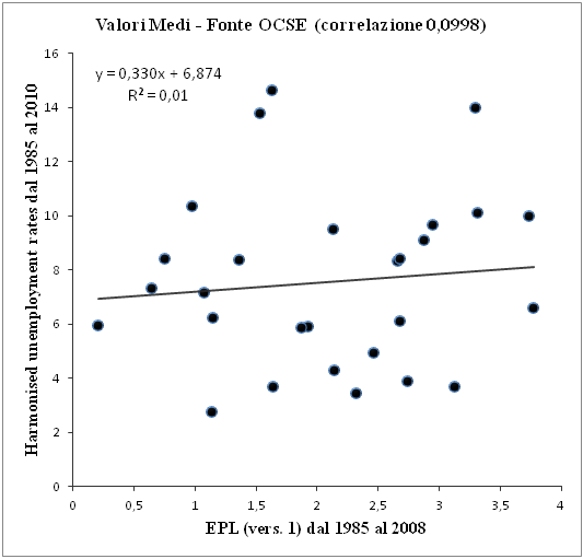 Da più parti nel dibattito degli ultimi giorni sulla riforma del mercato del lavoro è emersa l’osservazione che non è rendendo più precario quest’ultimo che si incentivano la domanda di lavoro e lo sviluppo. E d’altra parte sono a confermarcelo, ancora una volta, i numerosi rilievi provenienti da studi comparati sul tema, come ci illustra nel suo articolo Emiliano Brancaccio: “La figura seguente riproduce una delle numerosissime tipologie di test effettuati in questi anni dall’OCSE e da molte altre istituzioni per verificare l’esistenza o meno di una correlazione tra flessibilità del lavoro e disoccupazione. Il grafico mette in evidenza che non si ravvisa alcuna correlazione tra indici di protezione del lavoro (EPL, Employment Protection Legislation) e tassi di disoccupazione.”