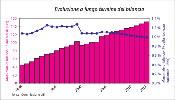 Come si può notare, sebbene il bilancio aumenti in termini assoluti, esso è tendenzialmente discendente dal 2000 ad oggi se raffrontato al reddito nazionale lordo(*).