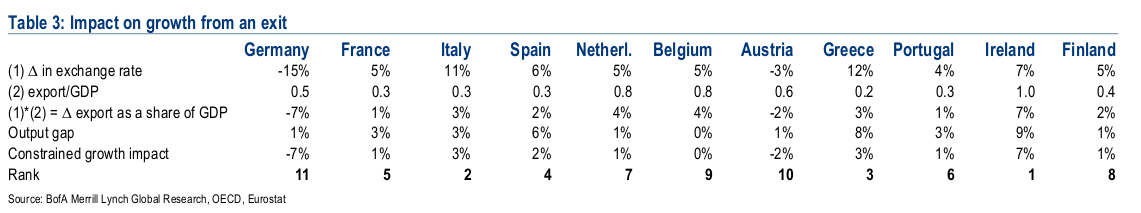 L’eventuale uscita dall’euro, scrive Merrill Lynch, oltre a rendere possibile, attraverso la svalutazione, il riequilibrio della bilancia commerciale e in prospettiva una crescita guidata dalle esportazioni, avrebbe effetti benefici anche sui tassi di interesse, poiché i mercati sarebbero rassicurati dal ritorno alle monete nazionali, fattore che ridurrebbe la possibilità di un default.