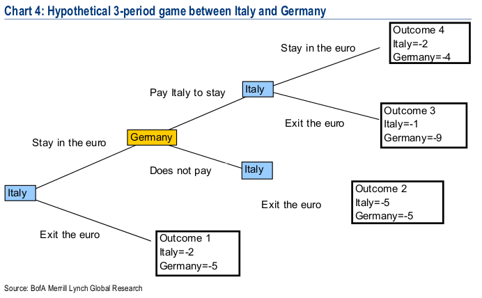 Athanasios Vamvakidis e David Woo di Bank of America Merrill Lynch pronosticano l’uscita dell’Italia dall’Euro, a sorpresa, prima della Grecia, in uno studio rilasciato pochi giorni fa. O almeno è ciò che potrebbe accadere applicando la teoria dei giochi. Secondo i due economisti l’Italia potrebbe avere diversi vantaggi nell’abbandonare volontariamente l’euro, prima che siano i mercati a deciderlo. Se così facesse, godrebbe di “benefici in termini di miglioramento della competitività, crescita economica e finanza pubblica”. Il nostro paese, in particolare, non si troverebbe ancora in una posizione maggiormente vincolata come la Grecia.