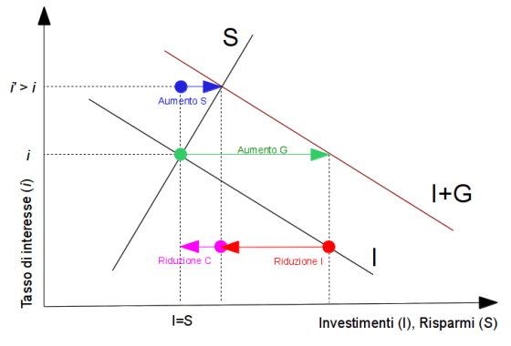 Il grafico rappresenta l’andamento degli investimenti (I) e del risparmio (S) al variare del tasso di interesse. Ove le due rette si incrociano, si determina il prezzo di equilibrio tra domanda e offerta, cioè il nostro tasso di interesse i. Partendo da una situazione di equilibrio, se si provasse ad aumentare la spesa pubblica (G) si otterrebbe una nuova retta I+G che, incrociando la retta dei risparmi S in un punto più alto, determinerebbe un tasso di interesse i’ maggiore di quello di equilibrio i. Ciò però avrebbe effetti negativi sull’investimento (privato) I, poiché gli imprenditori subirebbero maggiori costi per finanziarsi. Inoltre l’aumento del tasso di interesse avrebbe conseguenze negative anche sui consumi come riflesso dell’aumento del risparmio.