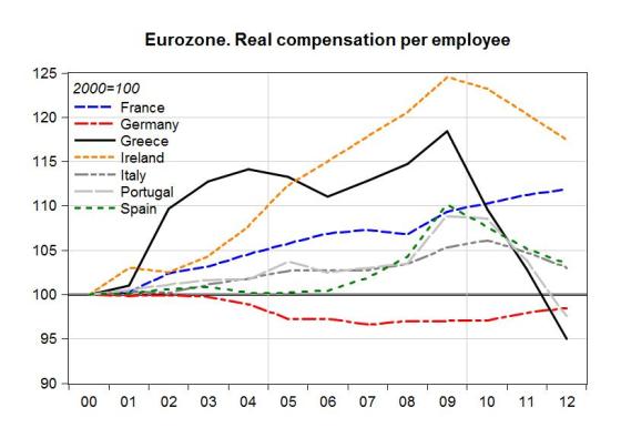 Per affrontare quindi il problema europeo, dove esiste un regime di cambi fissi, occorre in primo luogo chiedersi se una riduzione salariale nei paesi periferici possa o meno essere efficace. L’esperienza dice che non sta accadendo.