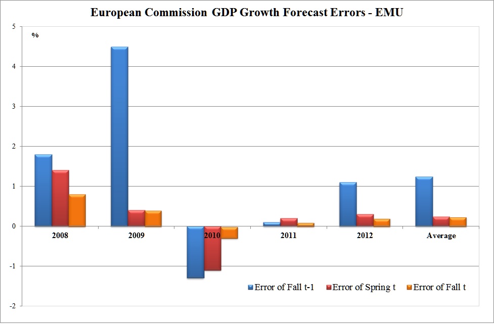 Quel che veramente segnalano gli errori di previsione della Commissione (e non solo) è la sottovalutazione della forza della politica di bilancio in una congiuntura fortemente depressa. nel 2010 l’eu era sotto l’impatto delle stimolo monetario e fiscale varato nel 2009 in molti paesi EU, e l’effetto è stto maggiore del previsto. Nel 2011 l’Eu era sotto l’imptto della svolta di austerità del 2010, e così negli anni successivi… e ha sottostimato l’impatto. Inoltre la crisi degli spread – causata dai rialzi dei tassi d’interesse, inopinati, della prima parte del 2011, ha pesato.