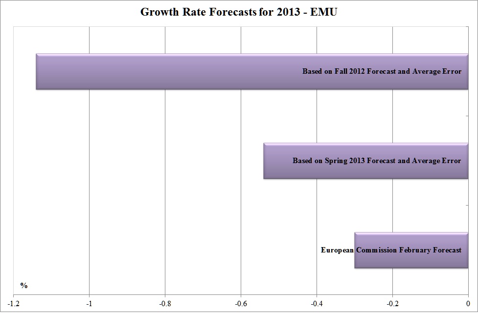 A questo punto ho la mia personale previsione per la crescita 2013 dell’eurozona. Si va da -0,54% a -1,14%. La Commissione prevede -0,3%. Staremo a vedere …