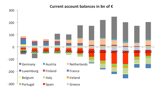 L’irresponsabilità semmai è stata di alcune istituzioni finanziarie dell’Europa “core”, queste sì, soprattutto tedesche. Come si spiega altrimenti il sempre crescente afflusso di capitali esteri verso la Grecia (per fare un esempio), quando dall’andamento delle partite correnti era evidente già dal 2000 che la Grecia si stava avvitando nella spirale del debito estero? (http://www.tradingeconomics.com/greece/current-account-to-gdp) Perchè continuare a gonfiare (e a ritmi accellerati) una bolla che si sapeva sarebbe esplosa?