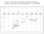 L’Italia non fa eccezione a questa regola; anzi è uno di quei paesi dove maggiore è stata la riduzione delle protezioni all’impiego, misurate dall’indice dell’Oecd (-1,68 nel periodo 1990-2008, versione 1, in valore assoluto non-inferiore a nessun altro Paese OECD, ed idem nel periodo 1998-2009, con -0,68, versione 2), e dove meno favorevole è stata la dinamica della produttività del lavoro. Non è quindi nella eccessiva rigidità del mercato del lavoro che risiede probabilmente l’origine della stagnazione, se non del declino relativo, della produttività del lavoro italiana. Anzi, si potrebbe argomentare che quelle riduzioni di protezioni all’impiego, abbiano potuto disincentivare le imprese a realizzare i guadagni di produttività che nel frattempo molti altri Paesi competitors dell’Italia andavano realizzando, risultando che i due fenomeni “più flessibilità” e “meno crescita della produttività” sono tra loro statisticamente associati. Lasciamo agli amanti di sofisticate elaborazioni statistiche ulteriori conferme di tale fatto stilizzato, e le relative spiegazioni. Noi ci limitiamo a segnalare che i fatti stilizzati puntano a demistificare una falsa credenza.