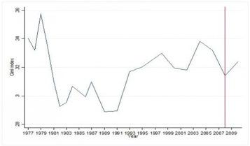 Molti commentatori sostengono che la diseguaglianza è un effetto della crisi: in realtà la diseguaglianza in Italia viene da lontano. Guardiamo l’andamento dell’indice di Gini – che misura la disuguaglianza complessiva tra i redditi delle persone – tra il 1977 e il 2010, ripreso da Inequality Watch (con dati Istat):