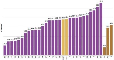 La spesa pubblica italiana non è particolarmente più alta che negli altri paesi europei (si veda il grafico di fonte Eurostat): in percentuale sul Pil (dati 2010), era in linea con la media ed era più bassa che in molti altri paesi, inclusa la Francia, il Belgio e i rigorosi paesi nordici (Danimarca, Finlandia e Svezia).