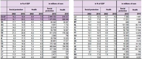 Mediamente, in Europa (Ue a 27), più di metà di quella spesa (54.7%) è “sociale” – comunemente chiamata welfare –, ovvero copre spese per la protezione sociale e la sanità. L’Italia, nel contesto europeo non fa “peggio” degli altri e non è nemmeno particolarmente generosa. La tabella qui sotto, dalla stessa fonte Eurostat, è illustrativa. Tra il 2002 e il 2010, la spesa per protezione sociale in Italia è passata dal 17.6 al 20.4 per cento, in linea con la media dell’Eurozona e inferiore a Danimarca, Francia, Finlandia, Svezia, Austria e persino Germania. Questa voce include sussidi alla disoccupazione e alla famiglia, sussidi di povertà ed altri benefici, oltre alla spesa per pensioni. La spesa sanitaria, nello stesso periodo, è cresciuta di poco più di un punto percentuale, passando dal 6.3 al 7.6 per cento del PIL, in linea con la media e inferiore a quella di molti Paesi.