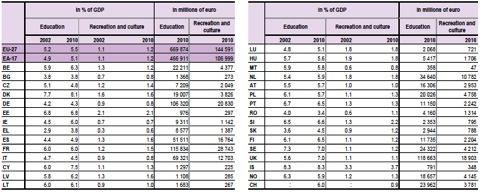La spesa per sussidi alle imprese, infrastrutture e altre voci economiche tra il 2002 e il 2010 è invece scesa, in Italia, dal 4.1 al 3.8 per cento del Pil, mentre la media Ue è aumentata dal 4.2 al 4.9. Lo stesso dicasi per la spesa per istruzione e cultura, che nello stesso periodo è passata dal 5.6 al 5.3 per cento del Pil, contro una media europea in aumento dal 6.3 al 6.8 per cento del Pil.