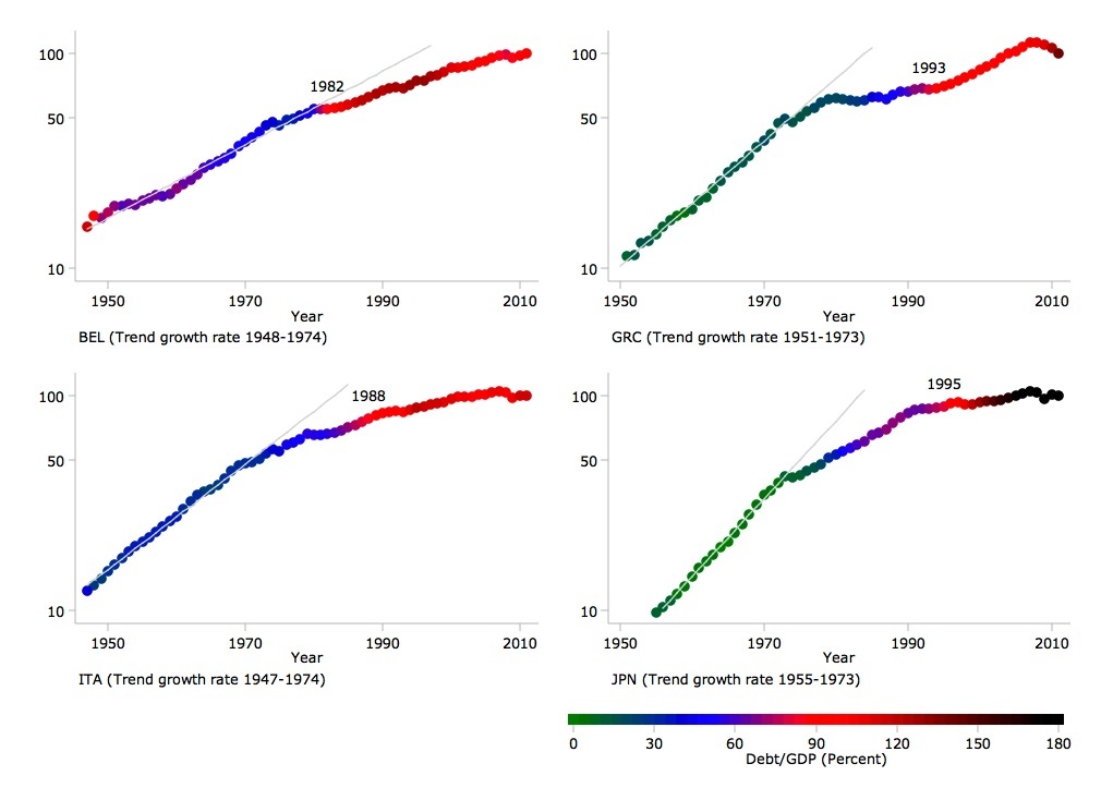 Anche se meno ovvio, per il Belgio la maggior parte dell’incremento del debito/PIL è avvenuto negli anni ’80 ed è stato in gran parte il risultato di una discontinuità nelle serie dei dati. Secondo i dati sul sito web di Reinhart e Rogoff, il debito pubblico lordo del Belgio era il 62,5% del PIL nel 1970 e la caduta (il debito/PIL si attesta al 57,8% nel 1974, il PIL reale ha raggiunto il picco quell’anno). Tuttavia, dal picco del PIL reale nel 1948 al picco nel 1974, la crescita economica media in Belgio è stata del 4,2% l’anno. Quando l’economia ha toccato il fondo nel 1975, il debito era solo il 54,4% del PIL e non ha raggiunto il 90% fino al 1983. E nel 1975-1983 la crescita media è stata solo il 2,2 per cento all’anno. Per gli altri paesi, è ancora più evidente che le economie hanno rallentato ben prima di raggiungere alti livelli di debito.
