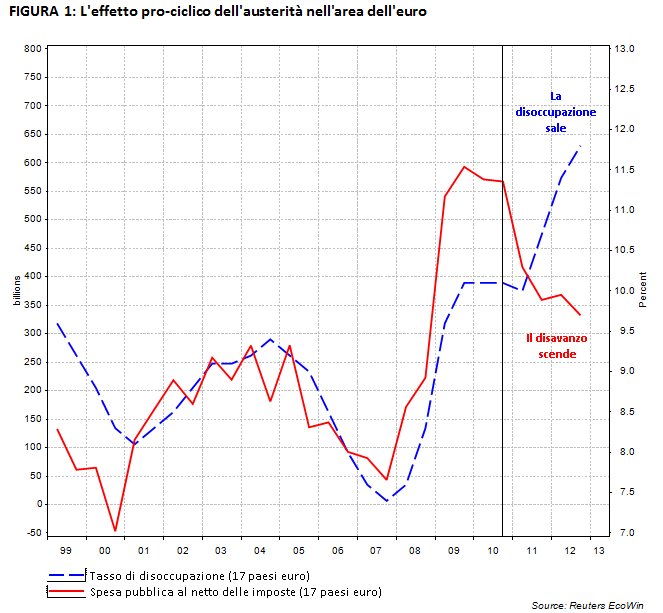 A partire dal 2010, e soltanto in Europa, accade qualcosa di diverso. Nel mezzo di questo monumentale aggiustamento (già non indolore), parte la battaglia (persa in partenza) dell’austerità. Nel momento in cui più occorre alleviare gli effetti della crisi su famiglie e imprese, le tasse aumentano e si taglia un po’ di spesa pubblica. È sacrosanto l’obiettivo di migliorare la qualità della spesa pubblica, e lo è altrettanto il recupero dell’evasione, ma per evitare di creare disoccupazione questi due obiettivi andrebbero perseguiti sempre a parità di spesa pubblica netta e quindi con una simultanea riduzione di tasse e balzelli su lavoro e imprese e delle aliquote su chi le tasse le paga regolarmente.
