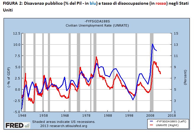 Prima dell’austerità, l’Europa era già orfana della politica fiscale: i singoli paesi si erano impegnati a rispettare i vincoli dell’unione monetaria senza che si fosse prima provveduto a creare un meccanismo centrale e condiviso di stabilizzazione fiscale. In caso di recessione, rimaneva operativo solamente il ben noto “meccanismo automatico” descritto dai manuali di macroeconomia: la caduta dei redditi riduce gli introiti fiscali attenuando l’impatto della recessione su famiglie e imprese e arrestando il moltiplicatore negativo del reddito. Nella Figura 1, la corrispondenza tra disavanzo pubblico e disoccupazione prima dell’austerità è inequivocabile. E chi pensasse che si tratti di una coincidenza accidentale può valutare nella Figura 2 la stessa relazione negli Stati Uniti dal 1948 ad oggi. In entrambi i casi, il disavanzo pubblico (sempre in ragione del “meccanismo automatico” di aggiustamento fiscale) è ampiamente scandito dall’andamento ciclico dell’economia.