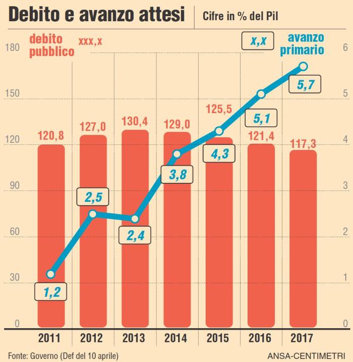 Permettetemi un commento: Se l’ avanzo primario per l’ Italia del 2013 sara’ 2,4% quasi come il 2012 , suponendo di conseguenza un deficit di 3% ,come l’ anno scorso e una diminuzione del pil del 2%, allora il rapporto debito/pil chiudera’ quet’ anno al 133%.