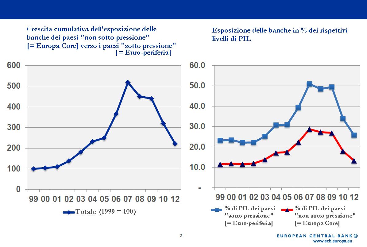 Da dove venivano i finanziamenti che hanno fatto esplodere il debito privato? Un aspetto particolare del processo di integrazione finanziaria europea dopo l’introduzione dell’euro è stato un deciso incremento nelle attività bancarie tra paesi. L’esposizione delle banche dei paesi del centro verso i paesi della periferia è più che quintuplicata tra l’introduzione dell’euro e l’inizio della crisi finanziaria.