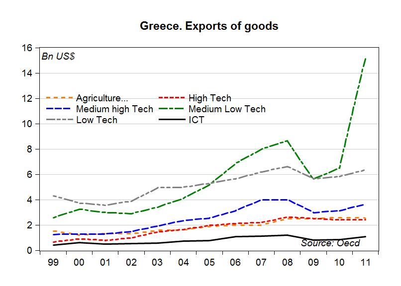 [NB la forte crescita della voce delle esportazioni “Medium-low tech” è dovuta all’aumento nel prezzo del petrolio raffinato: le esportazioni in questa categoria passano dai 2 miliardi di dollari del 2010 a oltre 9 miliardi di dollari nel 2011. E’ un’altra nota dolente: una riduzione del prezzo del petrolio raffinato farebbe sparire il recupero della bilancia commerciale greca]